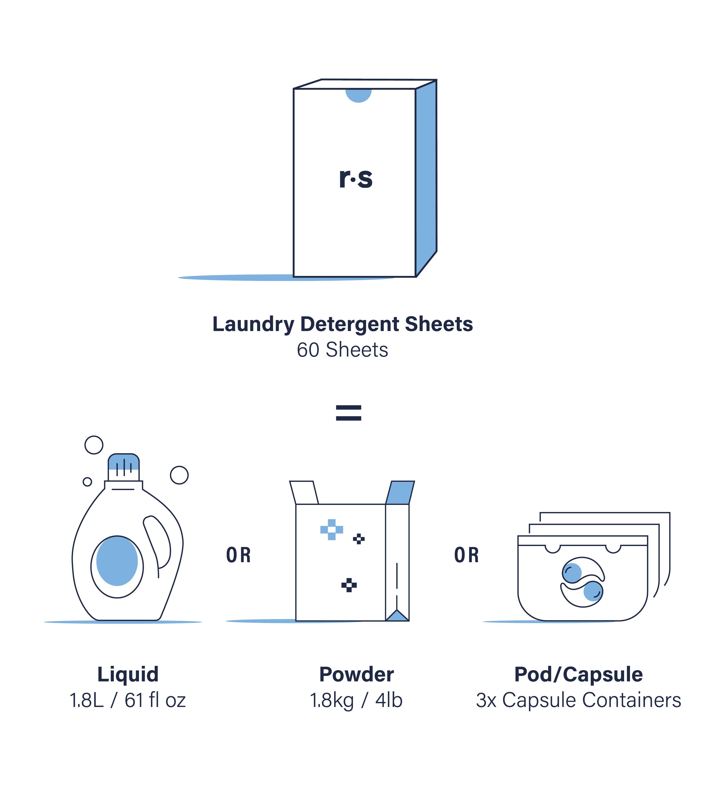 Each box has 60 sheets included - equivalent to 1.8kg/4lb or 1.8L/61 fl oz of traditional laundry powder or liquid.