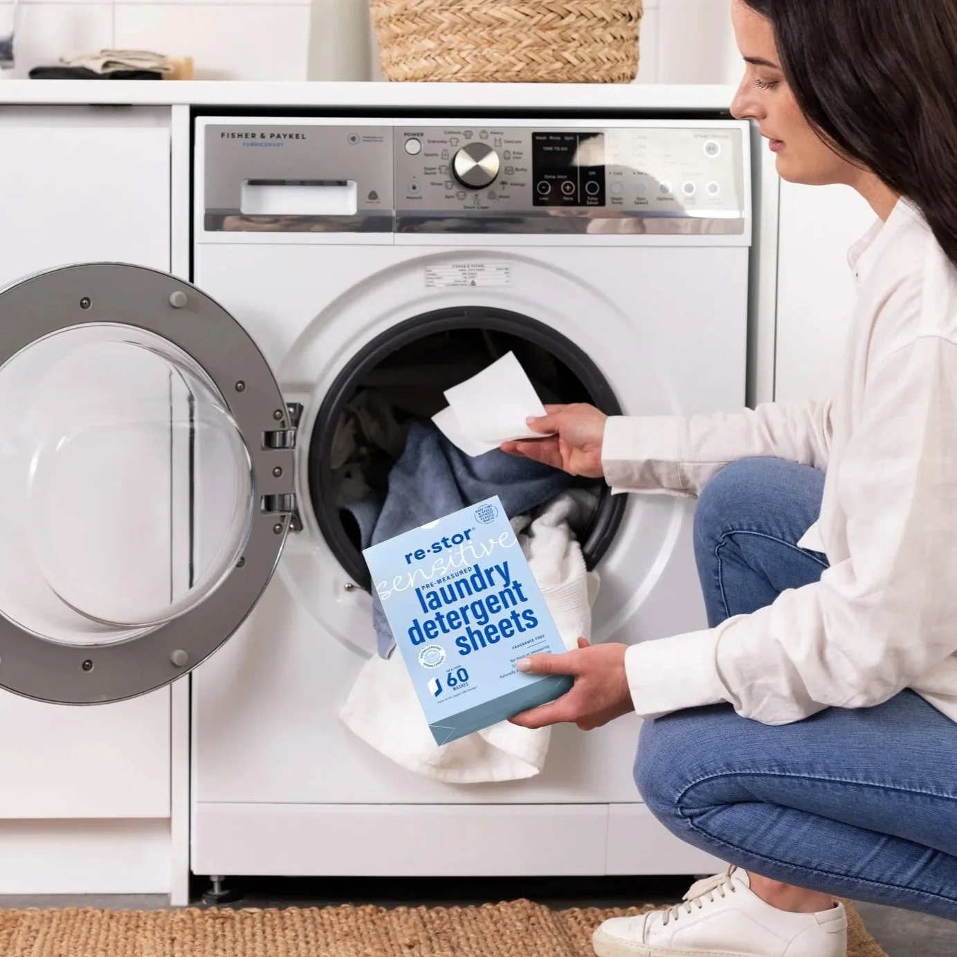 Take comfort in knowing every wash is safe for you and your family with Restor Sensitive Laundry Detergent Sheets. Specially designed for sensitive skin, our ultra-concentrated, fragrance-free formula delivers a powerful clean without irritation or harsh chemicals. Made with 94% naturally derived ingredients, each sheet is hypoallergenic, dissolves easily in any wash, and comes in plastic-waste free packaging.